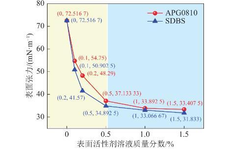 相同質量分數下,SDBS溶液表面張力普遍比APG0810溶液低。在表面活性劑溶液質量分數為0.01%、0.02%、0.05%時,SDBS分別較APG0810溶液低7.03%、13.92%、6.03%。這是由于APG0810為非離子表面活性劑,在水中不電離出離子,SDBS為陰離子表面活性劑,在水中電離出陰離子,同種電荷間斥力在宏觀上表現出表面張力低的現象。
