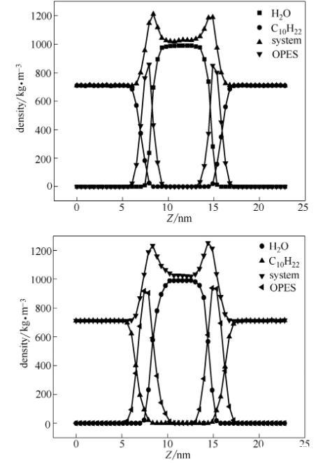 本文提取體系穩定的S80、S120進行分析,兩個體系的各部分密度圖如圖4所示。在平衡狀態下兩體系中水的平均密度分別為989.86 kg·m-3、992.43 kg·m-3,與國際溫標318 K時水密度990.2 kg·m-3值接近;另外,兩體系中癸烷平均密度為711.49 kg·m-3、710.72 kg·m-3,與真實狀況下癸烷密度711.2 kg·m-3值接近,這表明模擬體系的模型選擇、力場參數都是準確的,可以得出可靠結論。