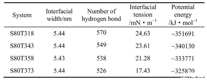 表2通過界面張力、表面活性劑與水的氫鍵數量、勢能3組數據對比得出表面活性劑的界面張力隨著溫度升高而降低的結論。數據表明在4組模擬實驗過程中,界面的寬度并沒有發生改變。因此界面張力下降的主要原因是由于OPES勢能的降低導致分子之間的作用力也隨之降低。