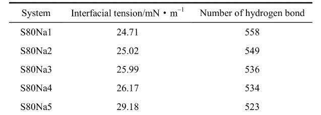 模擬數據顯示,隨著NaCl濃度的升高,表面活性劑在油水界面的界面張力僅有小幅升高,這是由于體系中不斷加入NaCl使得OPES更加親油,使得部分表面活性劑分子向油相中躍遷。另外,氫鍵數量有少量下降這是由于在體系不斷添加Na+、Cl-過程中,替換了水相中的水分子使得水分子數量減少從而影響了氫鍵數量。