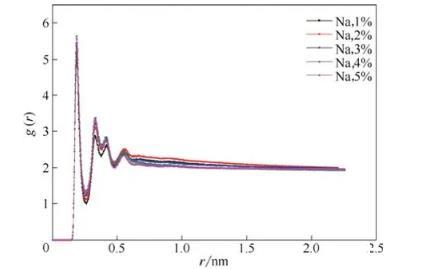 圖7在不同Na+濃度體系中磺酸基中的氧原子與水中氫原子的徑向分布函數