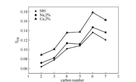 提取2%NaCl濃度時體系的疏水尾鏈碳原子序參數與同濃度的CaCl2體系進行對比,對比結果如圖9所示。在CaCl2溶液中疏水鏈碳原子的SCD值明顯高于無鹽溶液以及2%的NaCl溶液中的SCD值,因此,在Ca2+的環境下碳原子的擺動空間與靈活性要小于在Na+的環境中。