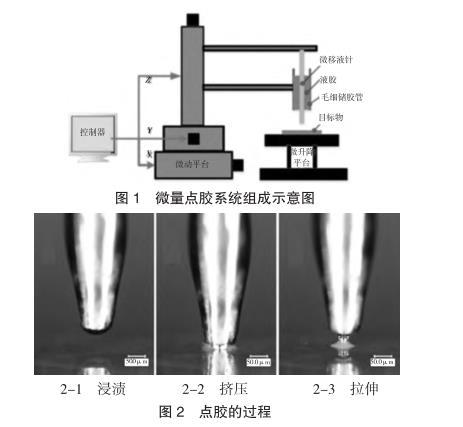 本課題組研制了一種基于移液針轉(zhuǎn)印原理的微量點膠系統(tǒng),該點膠系統(tǒng)所形成的膠斑直徑可達到數(shù)十微米,膠滴體積可達飛升-皮升的范圍。該系統(tǒng)的結(jié)構(gòu)如圖1所示。該系統(tǒng)由出膠單元、驅(qū)動單元和控制單元組成。其中,出膠單元為系統(tǒng)的核心,其主要包含微移液針和毛細儲膠管兩個關(guān)鍵元件,移液針通過在儲膠管內(nèi)的上下往復運動,實現(xiàn)膠液向基板的微量轉(zhuǎn)移。驅(qū)動單元由X/Y/Z三個方向的驅(qū)動電機和微升降平臺組成,用于驅(qū)動微移液針及點膠工件的運動。控制單元由PLC控制系統(tǒng)和LaBview開發(fā)的控制面板組成,實現(xiàn)對電機運動的自動控制。