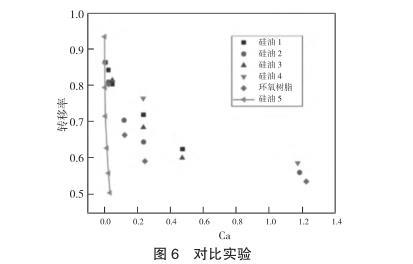 對不同黏度以及拉伸速度下的膠液進行測量并計算轉(zhuǎn)移率,如圖4所示,在忽略慣性力的條件下,采用無量綱數(shù)Ca來表示轉(zhuǎn)移率,對于表面張力相似且不同黏度的四種甲基硅油的轉(zhuǎn)移率有著相似的收斂情況。為了進一步印證Ca對轉(zhuǎn)換率的影響,引入與甲基硅油不同表面張力的環(huán)氧樹脂進行對比實驗,如圖5所示,表面張力較大的環(huán)氧樹脂的轉(zhuǎn)換率會比甲基硅油小,但整體趨勢相差不大,均會收斂到一定數(shù)值。之后,為了了解慣性力對轉(zhuǎn)移率的影響,選擇黏度較小的膠液進行實驗,同時加大移液針直徑使其脫離微量點膠的范圍,以提高慣性力對膠液傳遞的影響,如圖6所示,在通過增加膠液體積以提高慣性力影響的實驗中,膠液轉(zhuǎn)移率的變化與之前有極大差異。