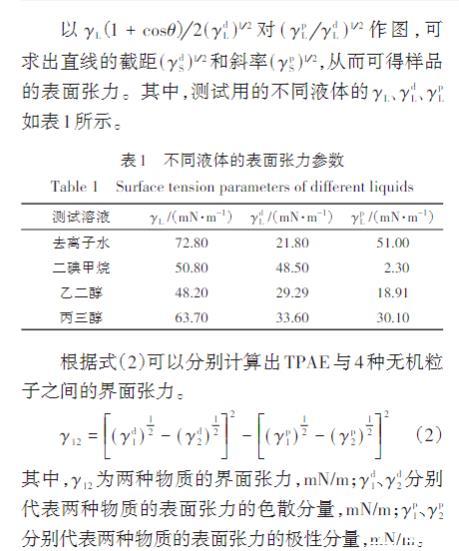 根據Owens-Wendt公式(1)來計算TPAE、Talc、CaSiO3、CaCO3、WI的表面張力γ。