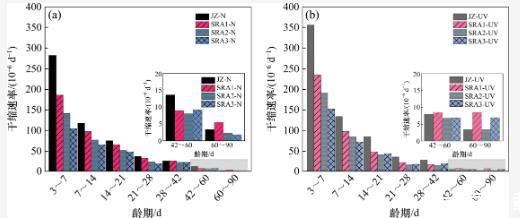 與基準組(JZ)不同,強紫外線輻射導致的SRA試驗組干縮速率的增長僅體現在3~7 d齡期內。與JZ組相比,SRA試驗組在強紫外線輻射環境中的干縮變形沒有明顯增長。此外,隨著SRA摻量的降低,強紫外線輻射導致的水泥石干縮變形的增長幅度減小。其中,SRA1組在強紫外線輻射下的干縮變形小于其在標準干燥環境下的干縮變形;SRA2組在強紫外線輻射下的干縮變形與其在標準干燥環境下的相當;SRA3組在強紫外線輻射下的干縮變形大于其在標準干燥環境下的干縮變形。