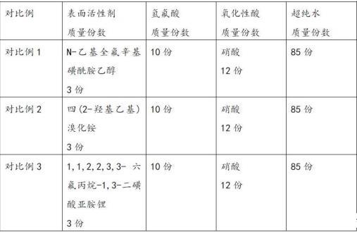基于表3可以看出,對比例1和實施例1的區別僅在于兩親性離子液體不同,其中,對比例1采用常規的N-乙基全氟辛基磺酰胺乙醇作為表面活性劑,導致表面張力增加,蝕刻選擇比降低。對比例2未加入1,1,2,2,3,3-六氟丙烷-1,3-二磺酸亞胺鋰,無法調節蝕刻速率。對比例3單獨采用1,1,2,2,3,3-六氟丙烷-1,3-二磺酸亞胺鋰作為表面活性劑,導致表面張力增加,蝕刻選擇比降低,而本發明合成的離子液體同時具有多氟基團、環狀結構、多羥基,能夠顯著降低表面張力,同時提高蝕刻選擇比。