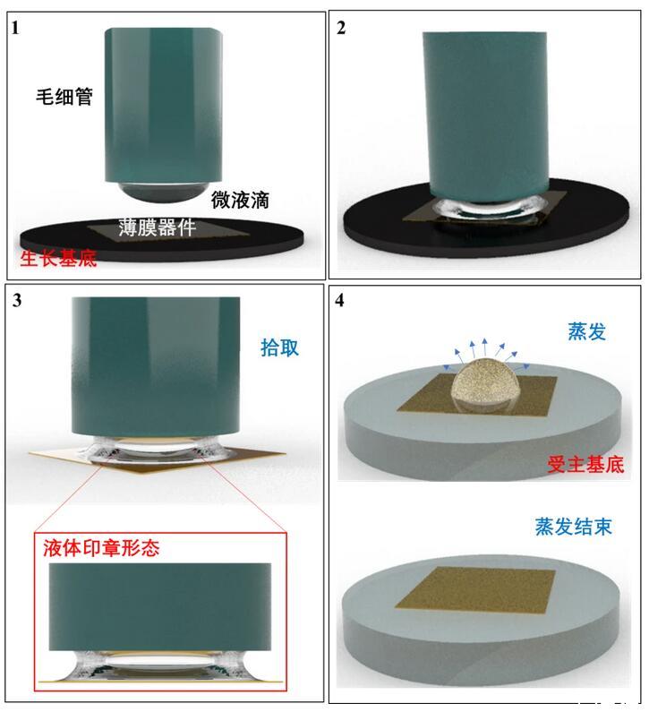 針對當前轉(zhuǎn)印技術中存在的問題,研究人員結(jié)合接觸式和非接觸式轉(zhuǎn)印的特點,提出了一種基于表面張力的液滴轉(zhuǎn)印方法,利用液體的流變特性,通過毛細管對液滴形態(tài)的控制,調(diào)控固-液界面的粘附力,從而實現(xiàn)柔性器件的轉(zhuǎn)印,該方法減少了超薄柔性器件的轉(zhuǎn)印過程中印章對器件的損傷,同時也為曲面電子器件的制造提供了新的思路。