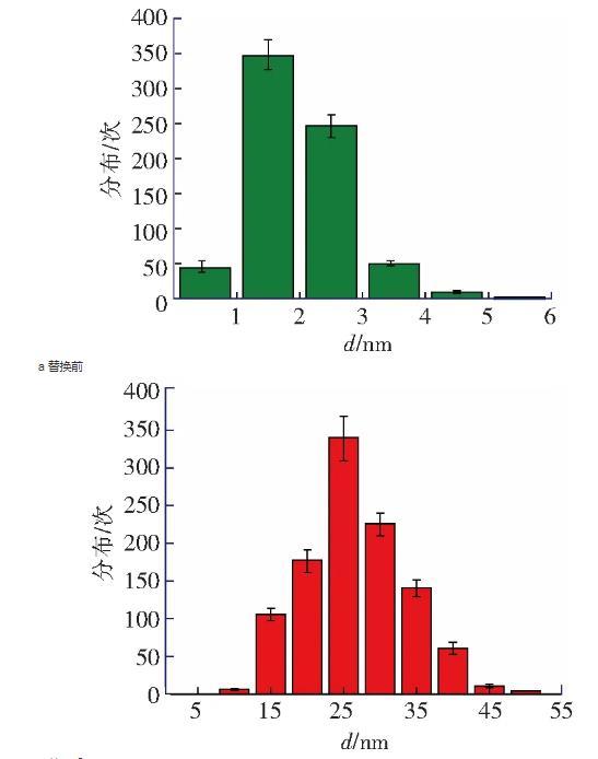 納米氣泡的高度在8~20 nm范圍之內(nèi),直徑在100~500 nm范圍之內(nèi),圖3c為圖3b中典型納米氣泡的截面圖。掃描得到納米氣泡圖像以后,在該表面上進行力曲線測量實驗,如圖2b所示。所有離曲線的‘跳進’距離均大于10 nm且是變化的,同時,由雙電層引起的斥力也消失了,不符合DLVO理論。這種‘跳進’距離不同的長程力應該是因為醇-水替換后HOPG表面上生成的納米氣泡造成的。圖3b中納米氣泡的覆蓋率約為21.8%,在該表面不同位置測量得到的力曲線必然會存在探針-HOPG相互作用的情況,即不都是探針-氣泡的相互作用的情況。然而,根據(jù)醇-水替換前后多次測量力曲線得到“跳進”距離d的統(tǒng)計分析(圖4a和圖4b),醇-水替換前測量得到的力曲線的“跳進”距離大部分都小于5 nm(99%),而醇-水替換后測得的力曲線的“跳進”距離均大于10 nm。這表明,醇-水替換后即使不是探針-氣泡相互作用的情況下,探針與HOPG表面的相互作用時仍然存在長程引力,而這應該是IGE造成的。該研究結果與Peng等人的研究結果一致,驗證了Limbeek對IGE與納米氣泡共存的假設。
