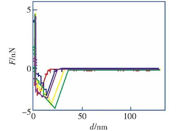 筆者利用原子力顯微鏡實驗測量了HOPG表面在醇-水替換前后的力距離曲線,發(fā)現(xiàn)醇-水替換前進針曲線的跳進距離小于5 nm,滿足DLVO理論;而在醇-水替換后納米氣泡覆蓋率為21.8%的情況下,進針曲線的跳進距離均大于10 nm,不能再用DLVO理論解釋,證明了IGE與納米氣泡共存這一現(xiàn)象。根據(jù)改進的Laplace-Young方程,結合文獻中對納米氣泡線張力值的計算結果,分析負的線張力對過渡區(qū)內(nèi)局部表面張力及局部固-液界面的影響,導致納米氣泡的接觸角反常小的原因之一。分析并討論雜質對納米氣泡接觸角的影響,指出IGE與納米氣泡共存、線張力及雜質影響的共同作用是導致納米氣泡接觸角“反常小”的原因。