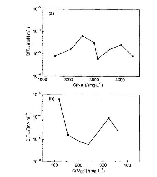 圖3金屬離子濃度對HDAPS/SDS混合表面活性劑溶液與原油的動態界面張力的影響