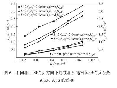 兩相流速、相比與傳質方向對體積傳質系數(shù)的影響見圖6。圖中結果顯示:分別用有機相溶質濃度和水相溶質濃度表示傳質推動力得到的體積傳質系數(shù)Koda和Koca隨著連續(xù)相流速的增加而增大,傳質方向相同(d→c)時,高相比的體積傳質系數(shù)(Koda或Koca)大于低相比的體積傳質系數(shù)。其原因主要還在于高流速和高相比的情況下,傳質相界面積a更大。