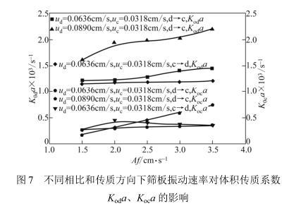 圖7不同相比和傳質方向下篩板振動速率對體積傳質系數(shù)Koda、Koca的影響