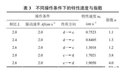 由表3中數(shù)據(jù)可以看出d→c的指數(shù)n在1.2左右,c→d的n在3.9左右,說明指數(shù)只與體系的物性有關,與操作條件無關,傳質方向不同導致指數(shù)n不同主要是有機相和水相分別作分散相的緣故。而特性速度與相比有關。由表3實驗結果可以看出,正丁醇-丁二酸-水體系的特性速度同時受兩相流速、相比和傳質方向的影響,它們都對液滴大小有影響。
