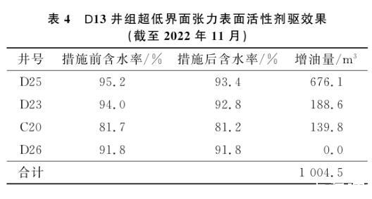油藏評估結果顯示,D13井所控區域剩余可采儲量約6.7×104m3,剩余可采儲量較大。為挖掘該井所控區域油藏潛力,2022年4月開始對該井進行超低界面張力表面活性劑驅油先導性試驗,2022年10月結束,共計注入表面活性劑溶液3 600 m3??紤]到滯留損失,試驗將表面活性劑質量分數設計為0.3%。在注入過程中,注入壓力由8.9 MPa逐漸上升至10.2 MPa,分析認為表面活性劑在地層中將剩余油乳化,乳化形成的油滴產生疊加的賈敏效應所致。從表3的試驗結果可知,截至2022年11月,施工結束1個月后,D13井對應4口生產井中,除D26井因注采井距相對較遠,尚未見效外,其余3口井均已開始逐漸見效。見效井含水率下降0.5%~1.8%,1個月內已實現在水驅基礎上增油1 004.5 m3,這說明超低界面張力表面活性劑能實現剩余油的有效啟動。