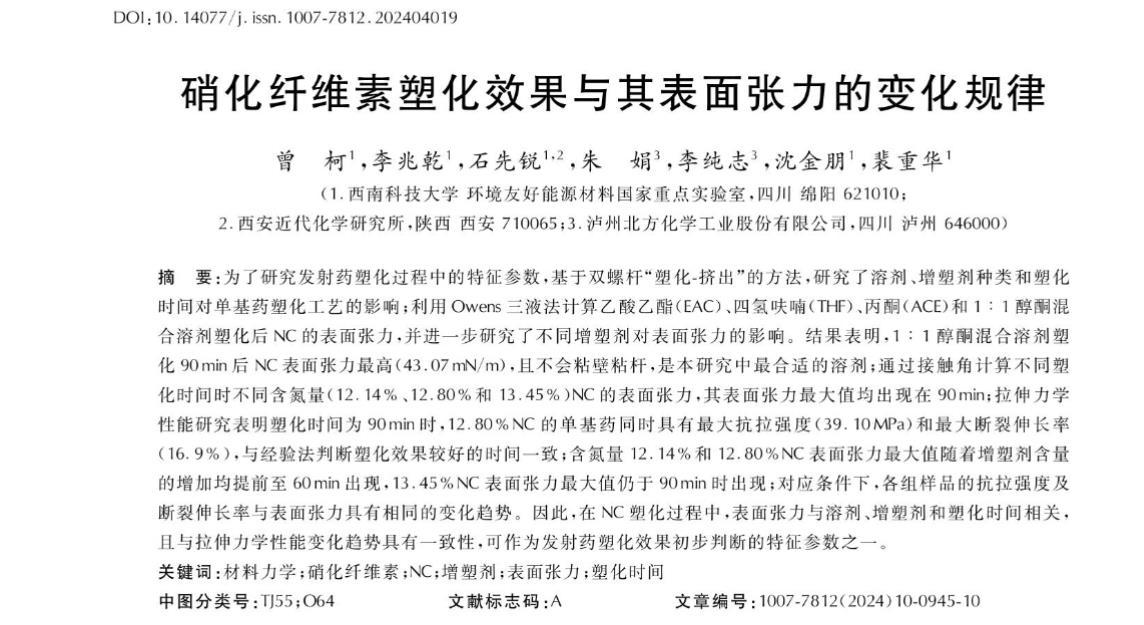 結果表明,1∶1醇酮混合溶劑塑化90 min后NC表面張力最高(43.07 mN/m),且不會粘壁粘桿,是本研究中最合適的溶劑;通過接觸角計算不同塑化時間時不同含氮量(12.14%、12.80%和13.45%)NC的表面張力,其表面張力最大值均出現在90 min;拉伸力學性能研究表明塑化時間為90 min時,12.80%NC的單基藥同時具有最大抗拉強度(39.10 MPa)和最大斷裂伸長率(16.9%),與經驗法判斷塑化效果較好的時間一致;含氮量12.14%和12.80%NC表面張力最大值隨著增塑劑含量的增加均提前至60 min出現,13.45%NC表面張力最大值仍于90 min時出現;對應條件下,各組樣品的抗拉強度及斷裂伸長率與表面張力具有相同的變化趨勢。