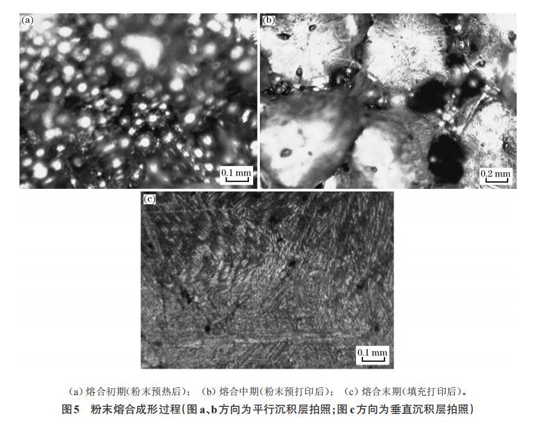 圖5粉末熔合成形過程(圖a、b方向為平行沉積層拍照;圖c方向為垂直沉積層拍照)