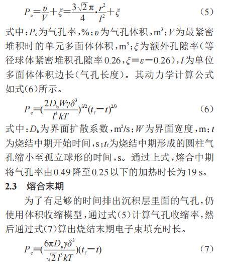 為了有足夠的時間排出沉積層里面的氣孔,仍使用體積收縮模型,通過式(5)計算氣孔收縮率,然后通過式(7)算出燒結末期電子束填充時長。