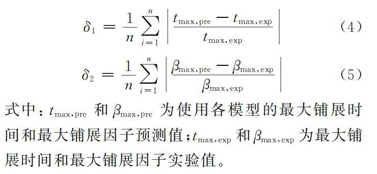 利用表1中的模型,對乙醇液滴沖擊過冷水平壁面的最大鋪展時間和最大鋪展因子進行預(yù)測,并采用相對平均偏差δ為評價指標(biāo),衡量不同公式的預(yù)測效果