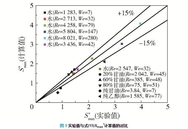圖9為Smax*實(shí)驗(yàn)值與式(15)的Smax*計(jì)算值的對(duì)比,式(15)的Smax*計(jì)算值與實(shí)驗(yàn)值誤差在大部分情況下都小于15%,因此在75 < Re < 9000,7 < We < 300時(shí),可使用式(15)預(yù)測液滴撞擊不銹鋼固體表面的最大鋪展面積。