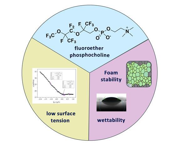 將氧原子引入到氟磷酸膽堿表面活性劑中,會對磷酸膽堿性能產生怎樣的影響呢?我們設計合成了一種新型氟醚磷酸膽堿表面活性劑(圖1b),考慮到長氟碳鏈和長氟醚鏈段具有生物累積性,我們選用了氟碳鏈為6的短鏈結構,并向其中插入兩個氧原子,將新化合物與一個鏈長相近的氟磷酸膽堿表面活性劑進行對比,結果表明新型氟醚磷酸膽堿表面活性更佳。我們進一步探索了新氟醚磷酸膽堿的泡沫性能與潤濕性能,結果表明氟醚磷酸膽堿的穩泡性好、可在聚四氟乙烯(PTFE)上潤濕,是一類具有良好應用前景的表面活性劑。
