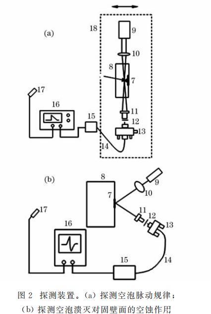 圖2探測裝置。(a)探測空泡脈動規律;(b)探測空泡潰滅對固壁面的空蝕作用