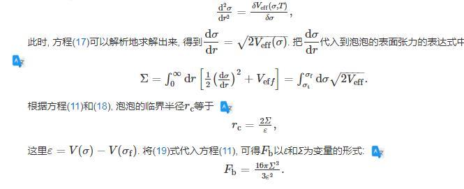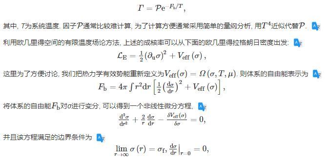 在偽真空的環境下,大小不一的真真空泡泡,由于量子漲落和熱漲落隨機出現并消失,直至泡泡的半徑大于等于臨界半徑,然后這些泡泡就會一直膨脹下去,完成一級相變的相變過程,并把多余的體系自由能以相變潛熱的形式釋放到環境中。基于這個機制,單位時間單位體積的臨界泡泡成核率可以表示為