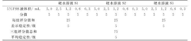 參照GB 7381-87所述方法,對合成得到的氟硅表面活性劑FSS在硬水中的穩定性進行了測定,結果如表3.