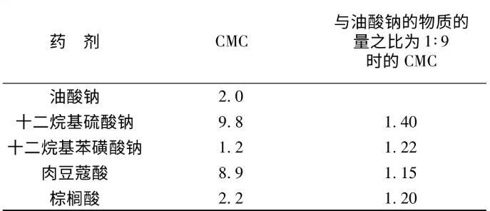 表3油酸鈉與磺酸鹽和羧酸混合水溶液的表面活性參數(298 K)×10-3 mol/L