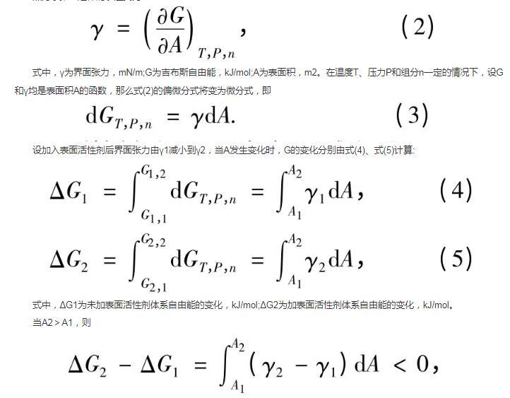 式中,γ為界面張力,mN/m;G為吉布斯自由能,kJ/mol;A為表面積,m2。在溫度T、壓力P和組分n一定的情況下,設G和γ均是表面積A的函數,那么式(2)的偏微分式將變為微分式,即