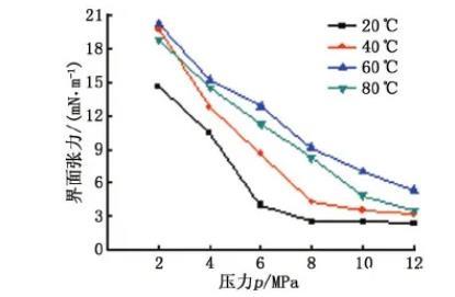 (1)壓力對界面張力的影響。壓力對界面張力的影響見圖6。可以看出,CO2-AOT體系的界面張力隨著壓力的升高逐漸降低,約在8 MPa時體系界面張力開始達到最低,之后壓力繼續升高,體系界面張力趨于穩定。原因在于壓力的升高會導致CO2-AOT兩相的密度差減小,有利于體系界面張力的降低;同時高壓使得AOT在CO2中的溶解度增加,使得CO2在兩相界面上吸引更多的表面活性劑分子,有利于表面活性劑降低界面張力。當壓力增加到8 MPa時,此時壓力繼續增加,兩相的密度差和CO2的溶解度系數均增加緩慢,導致界面張力趨于穩定。