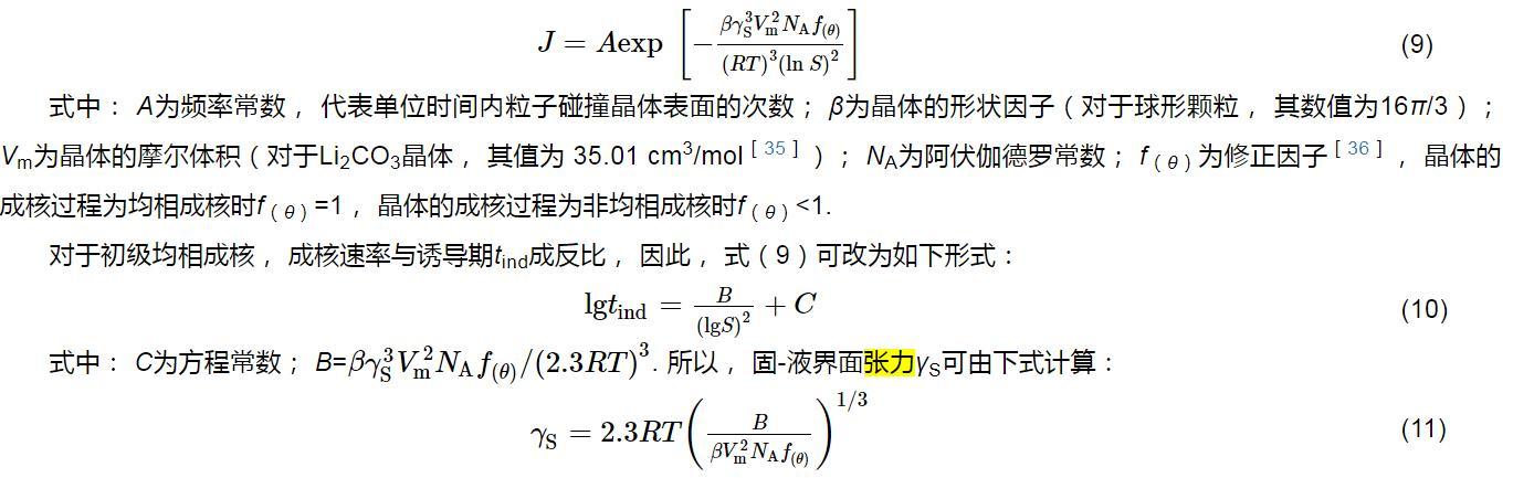 為了更深入地研究Li2CO3的成核過程,將以Li2CO3晶核與周圍溶液間的固-液界面張力為切入點來探討其成核機制.