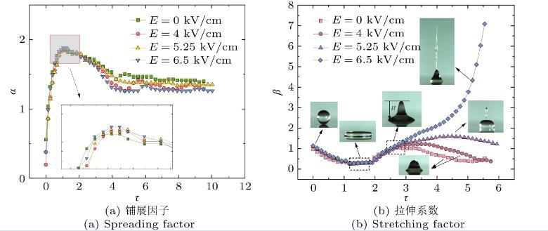 圖3不同場強下液滴無量綱因子隨無量綱時間變化(We=17.8)