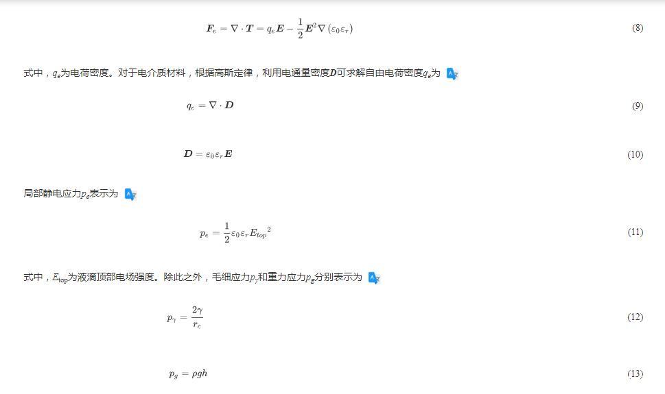 液滴在撞擊過程中受慣性力、重力、表面張力、靜電力和粘滯力的共同影響。鋪展階段,慣性力占主導作用。而在拉伸階段,慣性力和靜電力促進液滴的拉伸,重力、表面張力和粘滯耗散抑制液滴拉伸,在力的共同作用下產生了圖2的不同拉伸模態。在此過程中,由于電場是垂直方向,液滴的模態演化主要受到垂直方向力的影響,而水平方向受力作用較小,因此在后續分析中,我們假設水平方向受力變化對液滴形態的影響忽略不計,將重點分析垂直方向的受力情況,以此探討不同拉伸模態的機理。