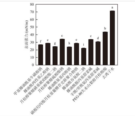 將10種表面活性劑的去離子水溶液(pH=6.0)進行表面張力測定,結果如圖1所示。去離子水的表面張力為71.81 mN/m;所有表面活性劑均可顯著降低去離子水的表面張力,其中PEG-80失水山梨醇月桂酸酯降低表面張力的能力最差,為43.73 mN/m;月桂醇聚醚硫酸酯鈉和椰油酰胺丙基甜菜堿水溶液的表面張力無顯著差異,分別為34.14和33.87 mN/m;辛酰/癸酰氨丙基甜菜堿水溶液的表面張力為30.54 mN/m;椰油酰兩性基乙酸鈉和磺酸羥丙酯月桂基葡糖苷交聯(lián)聚合物鈉水溶液的表面張力無顯著差異,分別為28.88和28.71 mN/m;甲基椰油酰基牛磺酸鈉水溶液的表面張力為26.74 mN/m;月桂醇聚醚磺基琥珀酸酯二鈉水溶液的表面張力為24.16 mN/m;椰油酰氨基丙酸鈉水溶液的表面張力較低,為23.84 mN/m;椰油酰谷氨酸二鈉水溶液的表面張力最低,為22.08 mN/m。