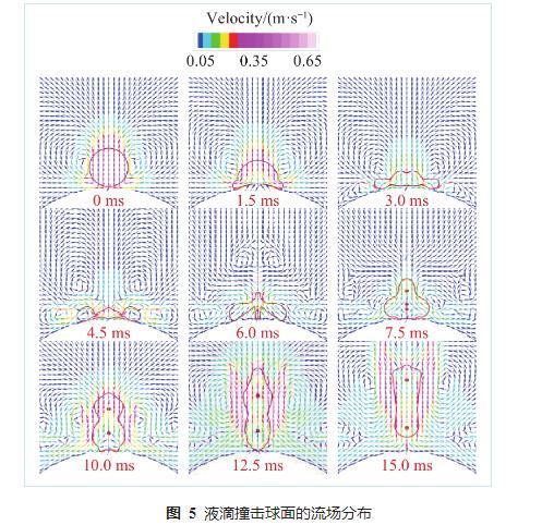 從圖中可以看出,0 ms時,液滴開始接觸壁面,液滴主要在慣性力作用下沿球表面快速鋪展,受球面形狀的影響,重力對液滴的鋪展起到一定作用,液滴通過克服黏性損失和液滴變形將動能轉(zhuǎn)化為表面能;1.5 ms時,由于蒸汽積壓,液滴底部呈扁平狀,此時氣膜較薄,底部球面上存在熱流密度明顯較大的環(huán)狀區(qū)域,同時液滴運動方向由軸向開始轉(zhuǎn)變?yōu)閺较颍?.0 ms時,隨著液滴繼續(xù)鋪展,流體向液滴前端積聚,徑向速度與壓力都開始減小,同時,液滴下方蒸汽流出后,周圍空氣沿球面流向液滴底部,形成回流;4.5 ms時,液滴達(dá)到最大鋪展,隨后,在表面張力的作用下開始收縮,外部環(huán)狀區(qū)域壓力與速度都較小,中心點處氣膜較薄,具有較高的熱流密度,同時,因為液滴形成了中間低四周高的結(jié)構(gòu),周圍氣流形成多個渦流;6.0 ms時,液滴逐漸收縮,外側(cè)速度與壓力明顯小于中心內(nèi)部,且液滴運動方向由原來的周向變?yōu)檩S向,中心區(qū)域與外側(cè)氣膜厚度都較薄,且中心區(qū)域更薄,因此熱流密度更大,多個渦流都在遠(yuǎn)離液滴;7.5 ms時,液滴進(jìn)一步收縮,外側(cè)速度與壓力都在升高,軸向方向速度減弱,由于液滴底部氣膜厚度不均勻,導(dǎo)致球面熱流密度分布呈多環(huán)形,不同區(qū)域差異較大,同時,因為液滴底部壓力較高,對底部氣膜擠壓作用較強,使氣流逸散速度進(jìn)一步提高;9.0 ms-13.0 ms階段,液滴逐漸脫離壁面,壁面熱流密度隨之減小,直到液滴完全脫離壁面,周圍氣流在液滴的帶動下逐漸沿軸向遠(yuǎn)離球面,壁面附近氣流速度逐漸減小。