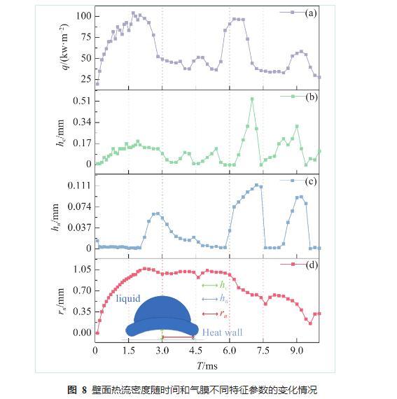 從圖7可以看出,相對于壓強的變化情況,壁面的熱流密度與氣膜的相關(guān)性更強,氣膜厚度的變化會引起熱流密度的變化。圖8是液滴撞擊過程中壁面平均熱流密度及氣膜不同特征參數(shù)隨時間的變化情況,圖8(a)是壁面平均熱流密度,可以看出,平均熱流密度的變化情況受液滴中心氣膜厚度影響較大,在前期鋪展階段中心氣膜厚度出現(xiàn)明顯波動時熱流密度也相應(yīng)波動,在液滴收縮階段,熱流密度變化明顯與頸部氣膜厚度成正相關(guān);圖8(b)是液滴中心氣膜高度,中心氣膜高度波動最為劇烈,在液滴撞擊前3 ms內(nèi),即液滴鋪展階段先伴隨不穩(wěn)定波動升高再保持穩(wěn)定,當(dāng)液滴開始收縮時出現(xiàn)大范圍的波動;圖8(c)是液滴頸部氣膜厚度,頸部與中心點通常為液滴底部氣膜厚度最薄點,也是熱流密度峰值點;圖8(d)是液滴的頸部半徑長度,它的變化規(guī)律與液滴鋪展情況相似,且可以用來表示液滴與壁面的有效換熱面積。相較其他兩項特征參數(shù)而言,液滴中心氣膜厚度顯然對熱力學(xué)能具有更高的影響。