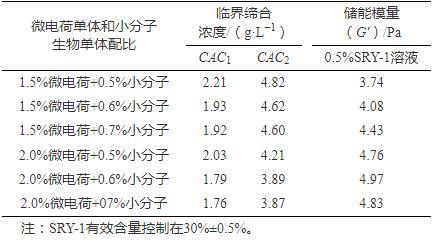 室內(nèi)合成實(shí)驗(yàn)研究發(fā)現(xiàn),微電荷單體對(duì)降低CAC2貢獻(xiàn)較大,用量?jī)?yōu)選為1.5%~2.5%,而小分子生物單體對(duì)降低CAC1貢獻(xiàn)較大,用量?jī)?yōu)選為0.5%~0.7%,兩種單體共同作用下臨界締合濃度降低和黏彈性提高顯著,最優(yōu)結(jié)果見表3。可見當(dāng)采用2.0%微電荷單體+0.6%小分子生物單體組合時(shí),溶液具有較強(qiáng)的黏彈性,此時(shí)SRY-1的CAC1,CAC2分別為1.79 g·L?1、3.89 g·L?1,對(duì)應(yīng)SRY-1用量接近0.18%、0.4%。
