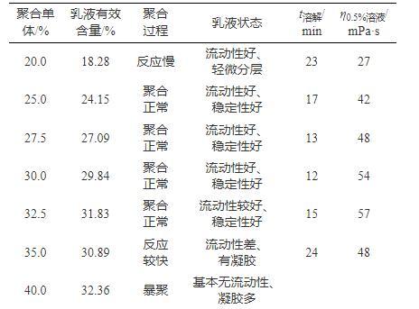 乳液中聚合物有效含量越高,增黏能力越強(qiáng),使用成本越低,聚合單體濃度直接決定乳液有效含量,并通過影響聚合反應(yīng)過程進(jìn)而影響減阻劑綜合性能。