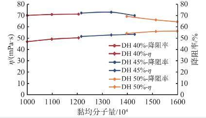 室內(nèi)通過控制水解度(40%~50%)制備了一系列的SRY-1樣品,配制成濃度為0.5%的溶液,測(cè)試聚合物不同分子量下的表觀黏度(30 min)和降阻率(Q=45 L/min)。如圖2所示,在優(yōu)化的水解度范圍內(nèi),SRY-1分子量均在1000萬以上,水解度越高,分子量越高;溶液表觀黏度隨分子量的增大而增大,但降阻率隨分子量的增大呈現(xiàn)先緩慢升高后較快降低的趨勢(shì)。主要是因?yàn)榉肿恿吭礁撸貜?fù)單元數(shù)愈多,分子間越易形成鏈纏結(jié),分子鏈具有更大的流體力學(xué)體積,溶液黏度增大,當(dāng)增大到一定范圍,溶液黏彈性受到影響,降阻率就隨之下降。由數(shù)據(jù)對(duì)比,SRY-1分子量控制在1200~1300萬為宜。