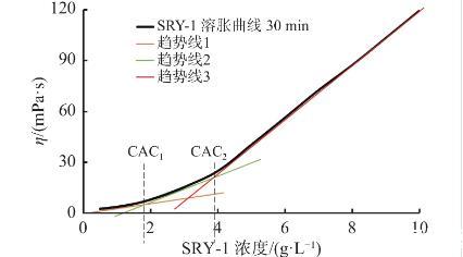 據(jù)研究表明,締合聚合物溶脹經(jīng)歷3個(gè)階段,分別對(duì)應(yīng)了兩個(gè)黏度突變的點(diǎn),即臨界締合濃度CAC;通過繪制聚合物溶液黏度-濃度曲線,擬合分析得到3個(gè)階段的趨勢(shì)線及公式,兩兩相交的點(diǎn)取絕對(duì)值即為臨界締合濃度值,計(jì)算得CAC1,CAC2,如圖3所示。根據(jù)曲線可以看出,在CAC1之前,溶液黏度增長(zhǎng)趨勢(shì)較緩慢,當(dāng)達(dá)到CAC1并向CAC2過渡時(shí),溶液黏度增長(zhǎng)相對(duì)加快,超過CAC2后,溶液黏度迅速增加,1.0%用量下終黏可達(dá)110 mPa·s以上。