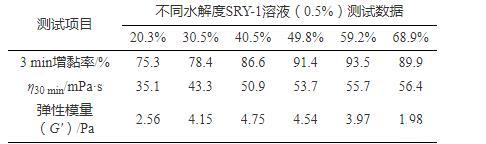 數(shù)據(jù)顯示,隨水解度增大,SRY-1增黏率和表觀黏度都顯著提高,但水解度超過60%后,增黏率又有所降低,SRY-1溶液G'呈現(xiàn)先增大后減小的趨勢(shì)。分析認(rèn)為:在一定范圍內(nèi),由于水解度增大,分子鏈更加伸展,分子間共價(jià)鍵作用更易形成彈性微觀網(wǎng)絡(luò)結(jié)構(gòu),彈性模量G'增大;隨著水解度繼續(xù)增大,聚合物分子流體力學(xué)體積持續(xù)增大而很難交叉纏繞,黏性行為明顯,彈性減弱,表現(xiàn)為彈性模量G'減小。因此水解度過度提高會(huì)造成增黏率下降,溶液黏性增強(qiáng),彈性降低的負(fù)面影響。由數(shù)據(jù)可知,SRY-1水解度為40%~50%時(shí),SRY-1的3 min增黏率可達(dá)90%以上,溶液黏彈性最為顯著。