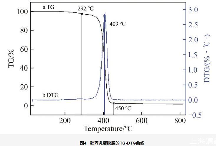 從圖4可以看出,膠膜失重分為3個階段:在292℃前,失重2.54%,此時失去的是膠膜中的水及小分子物質的揮發(fā),膠膜并未發(fā)生分解;293~450℃之間為共聚物的熱分解階段,該范圍失重95.30%,且分解速度較快,主要是Si—O、C—C、C—O和C—H鍵的斷裂所致;450~800℃之間失重0.43%,這是共聚物分子鏈的斷裂和分解,分解速度較為緩慢;800℃基本分解完全,僅剩下1.73%的灰分,證明硅丙乳液膠膜具有良好的耐熱性。由DTG曲線可以看出,409℃熱分解速率最大,說明硅丙乳液具有良好的熱穩(wěn)定性,這是因為在共聚物分子中引入了具有較高鍵能的Si—O—Si鍵的結果。