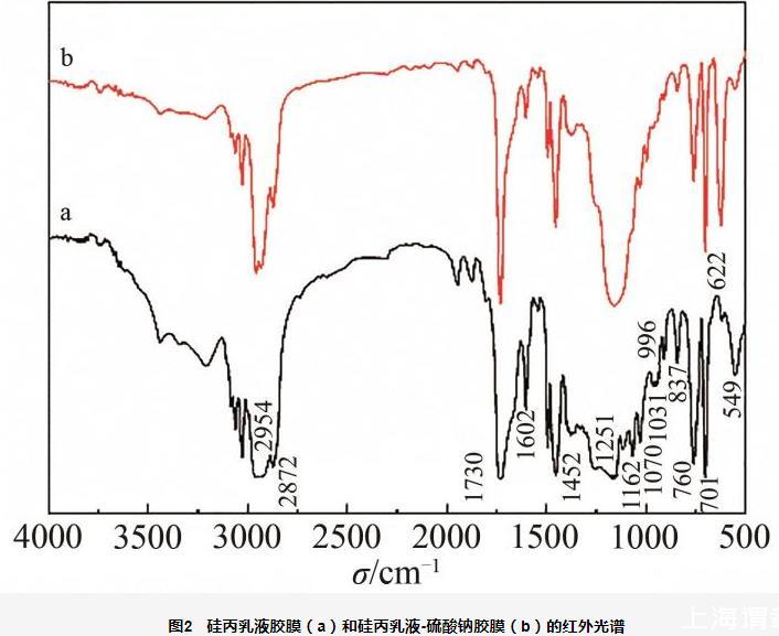 圖2硅丙乳液膠膜(a)和硅丙乳液-硫酸鈉膠膜(b)的紅外光譜