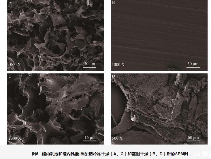 圖5硅丙乳液和硅丙乳液-硫酸鈉冷凍干燥(A、C)和室溫干燥(B、D)后的SEM圖