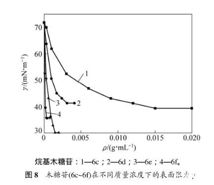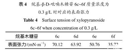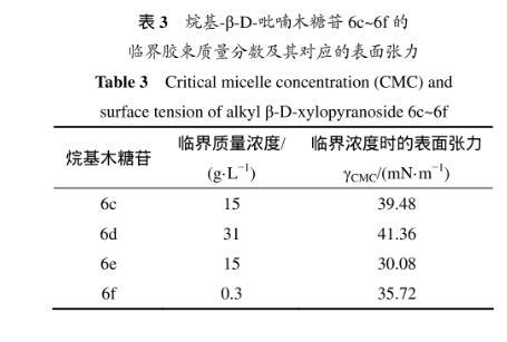 表3所示為烷基-β-D-吡喃木糖苷6c~6f的臨界質量分數及所對應的表面張力。溶液表面的吸附量達到飽和時(剛好飽和時的濃度即為臨界濃度),表面張力最小。從表3可以看出:辛基-β-D-吡喃木糖苷(6e)達到臨界濃度時對應的表面張力是最低的,能力最強。因為烷基木糖苷的表面活性是由其親水糖基和疏水烷基鏈共同決定,當烷基鏈長為=8(糖苷6e)時,親水性和疏水性達到最佳平衡,表面張力最低。
