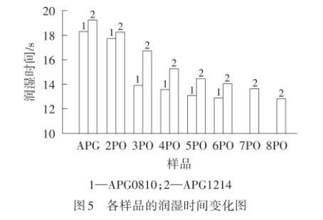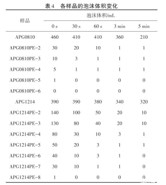 泡沫是氣體在液體中的分散體系,氣體成為氣泡被連續(xù)相的液體分隔開,氣體是分散相,液體是分散介質。在大規(guī)模的洗滌和印染工業(yè)中,泡沫給操作帶來不便,因此新型的低泡表面活性劑越來越受關注。由表4可以看出,PO基團引入APG中明顯地降低了泡沫的形成和穩(wěn)定性,而且在相同PO加合數下,APG0810變化更明顯,因此制備的系列樣品屬于低泡表面活性劑。