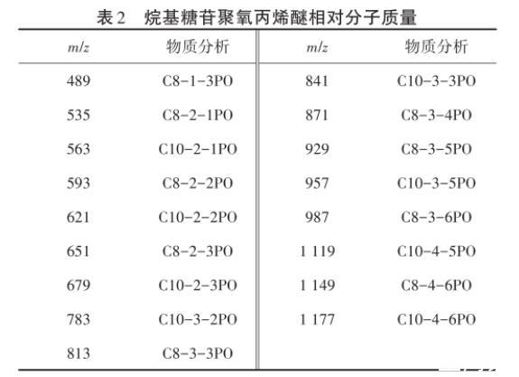 (1)以碳鏈數8/10、12/14的烷基糖苷(APG0810/APG1214)為原料,通過與環(huán)氧丙烷反應得到聚醚產物,并通過TOF質譜進行結構表征,結果表明PO基團成功引入烷基糖苷中。