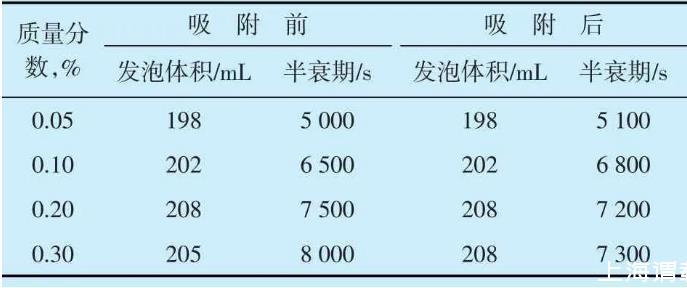 配制質(zhì)量分數(shù)為0.05%,0.10%,0.20%和0.30%的磺基甜菜堿泡沫劑,再分別充入純度為99.9%的氮氣,利用羅氏泡沫儀測試氮氣泡沫體系吸附前后的泡沫性能。評價結(jié)果(表1)表明,當(dāng)溫度為80℃時,不同質(zhì)量分數(shù)的氮氣泡沫體系在吸附前后發(fā)泡體積均保持在200 mL左右,半衰期大于5 000 s,表明均具有良好的起泡性能和穩(wěn)定性能。