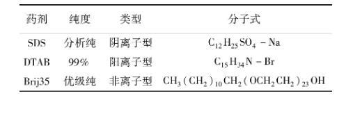選用3種表面活性劑開展浮選精煤脫水過濾試驗。3種表面活性劑分別為十二烷基硫酸鈉(SDS)、十二烷基三甲基溴化銨(DTAB)、月桂醇聚氧乙烯醚(Brij35)。3種藥劑的疏水端均為十二烷基,親水端分別為硫酸根、銨根以及聚氧乙烯醚,3種藥劑的物理化學性質見表3。